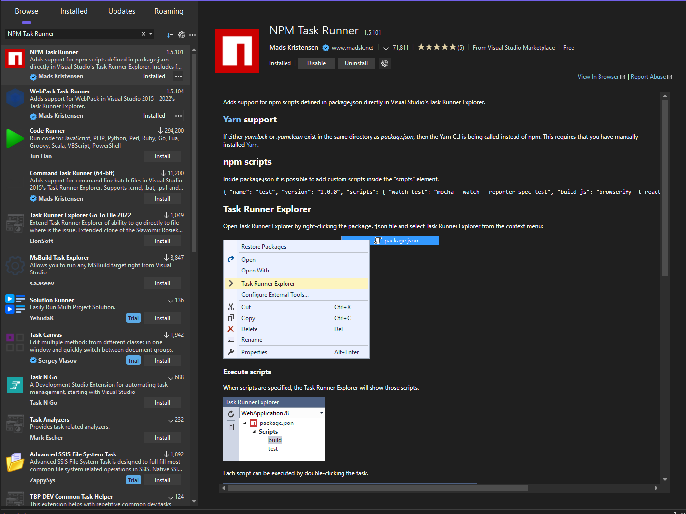 「Task Runner Explorer」といえ、Visual Studioの拡張機能はフロントエンドコードコンパイルを使える。