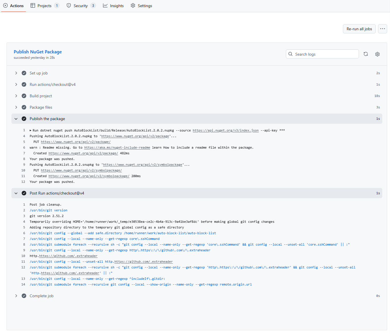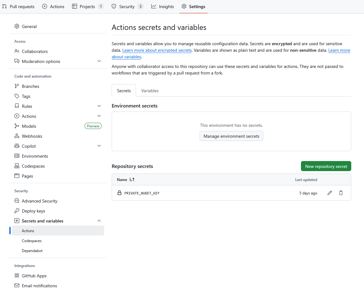 run: dotnet nuget push PROJECT_NAME/build/Release/PROJECT_NAME.${{github.ref_name}}.nupkg --source https://api.nuget.org/v3/index.json --api-key ${{secrets.PRIVATE_NUGET_KEY }}最後に、NuGet の API Key を GitHub Secrets に入れる。