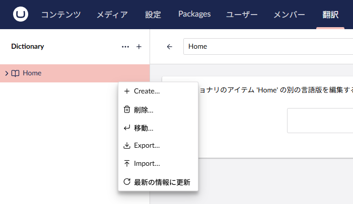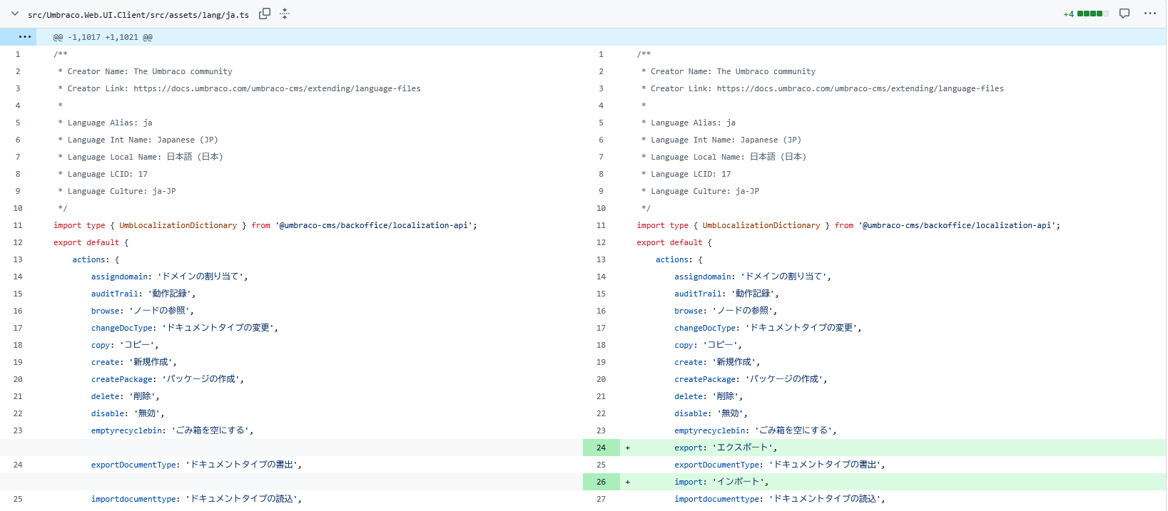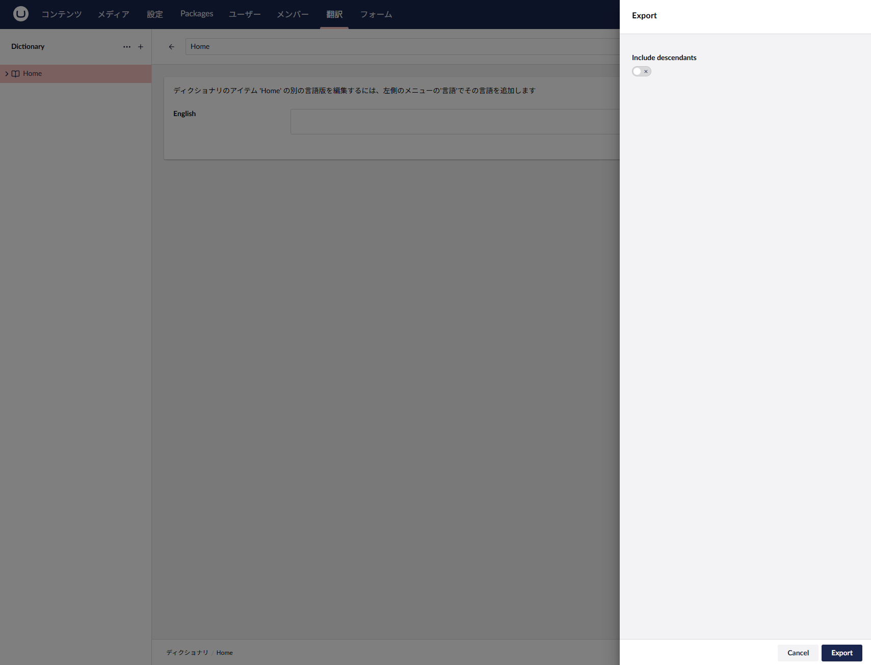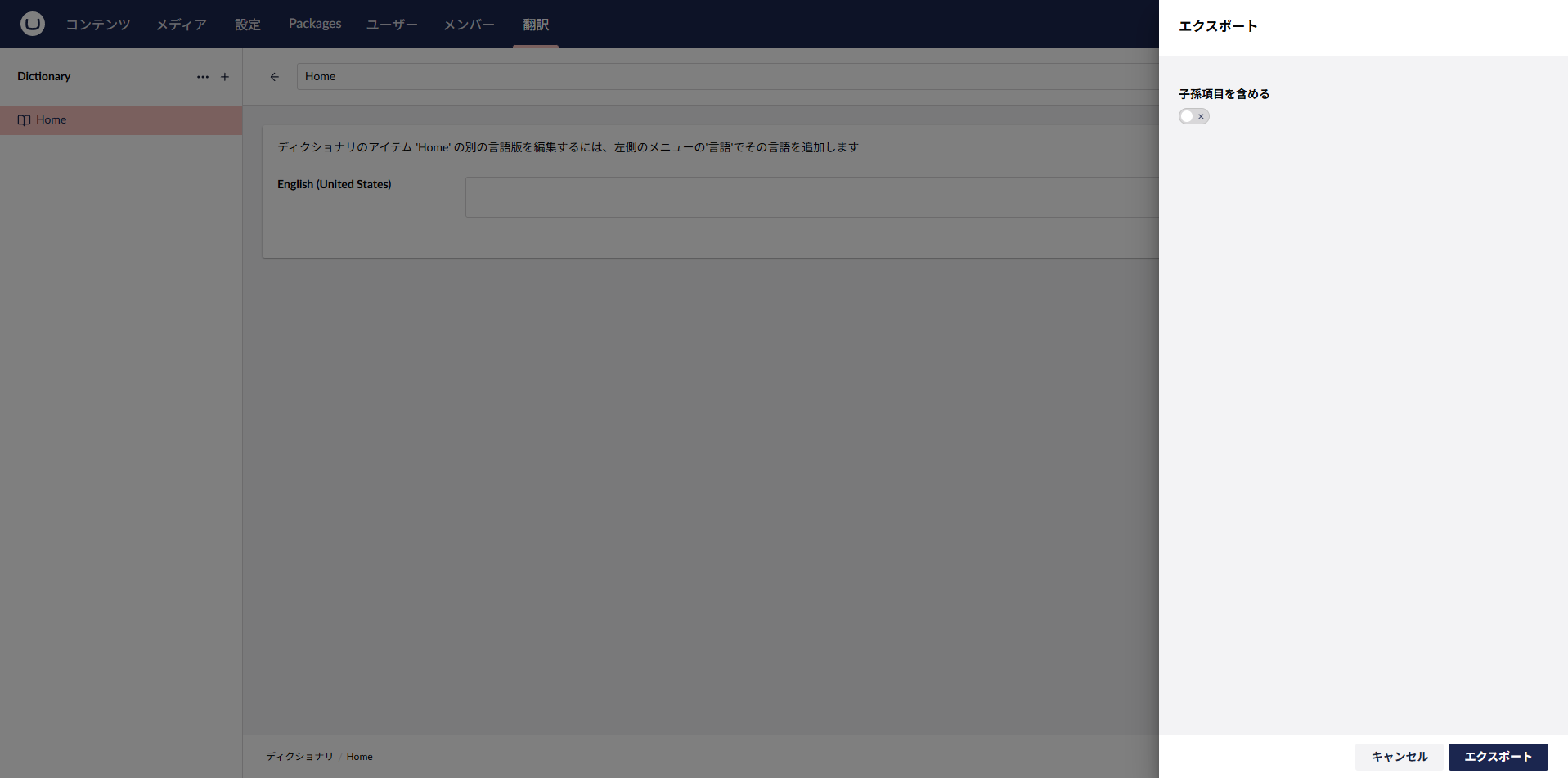 翻訳のセクションでは、「Export」と「Import」のラベルの翻訳が必要だよ!